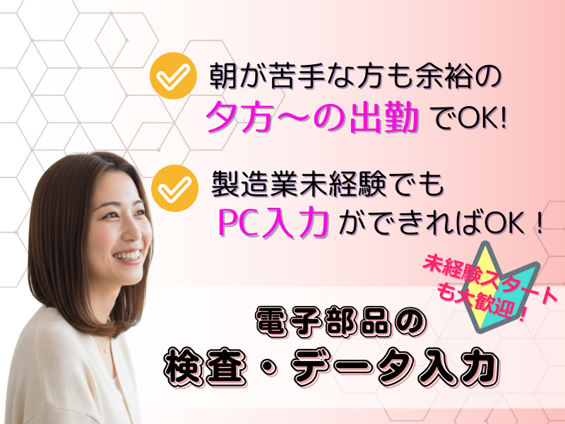 スマホなどに使用される 手のひらサイズの小さな電子部品(リレー製品)に、 不具合がないかを確認するお仕事です。 座って進める作業が中心なので、 立ち仕事のように足が疲れる心配もありません。 パソコンの基本操作(文字や数字の入力)ができれば問題ありません!詳細を見る 大津