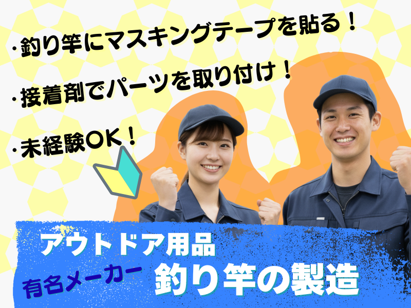 大手メーカーの釣り竿を仕上げる、 「軽作業・手芸感覚」のお仕事です。 力仕事は一切ありませんので、 体力に自信がない方も未経験の方も 安心してスタートできます! 【主なお仕事は…】 マステ貼り: 塗装前の竿の決まった場所に、 シールやマスキングテープを貼る 準備作業。 パーツ付け: 糸を通す小さなリングを、 接着剤で丁寧に取り付け。詳細を見る 職種