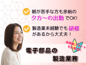 | 仕事内容 | スマホなどに使用される 小さな電子部品(リレー製品) の製造のお仕事です。 樹脂を使った作業や電子部品の組立て全般、 はんだ付けや溶接を行います。 2日程度の導入研修の後、 作業資格を取得(誰もが取得できる内容)して頂き、 実際行う作業の練習も十分にできますので、安心して現場に入る事ができます。 ※工場見学も大歓迎!職場の雰囲気や作業を直接確認する事ができます(^_^) ※未経験の方も大歓迎です! |