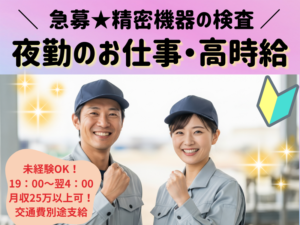 | 仕事内容 | *************** ◆朝起きるのが苦手な方 ◆夜勤で効率よく稼ぎたい方 おススメの求人です!! *************** 冷暖房完備の工場内にて、 製品(精密機器)の仕様検査をするお仕事です。 チェックリストに沿って、 正しく作動するかを1つずつ確認していきます。 チェックリストがあるので、 手順も明確で作業するのも安心です♪ ※在籍スタッフの8割は未経験からスタートされた方です(^^)/ ※夜からのお仕事をご希望の方、是非ご応募下さい! |