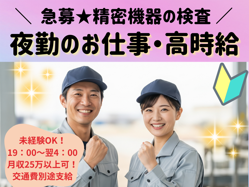 | 職種 | 【急募!月収25万以上可!】完成品(機械)の検査(夜から出勤♪) |