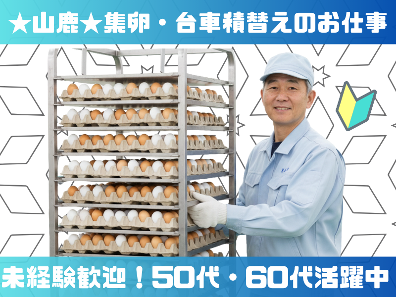 | 仕事内容 | ワクチン製造用の卵の生産補助のお仕事で、 集卵、台車積換え等の補助業務をお任せします。 ※養鶏から卵の洗浄、検品、ケース収納までオートメーション化 された工場です。 ※未経験の方も大歓迎です!40~60代の方も活躍中! |