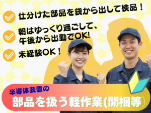 | 職種 | 【契約社員】【南関町】お昼からゆっくり出勤!半導体部品を扱う軽作業 |